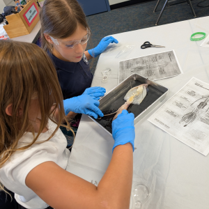 Next came squid dissection, a crowd favorite every year. Students learned squid anatomy, adaptations, and scientific dissection skills, all while building confidence with hands-on learning. The squid used were ethically purchased frozen bait and later donated to the Riverview Aquadome as food for marine animals. Thank you to teacher Katrin Rudge for loaning us the dissecting trays.