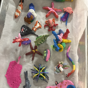 Students then dove into the world of coral reefs learning what coral is, how it grows, and what causes bleaching. Using photos with grid overlays, they practiced data collection like real scientists and explored current efforts to restore reef ecosystems. The hands-on highlight was the clay coral reef diorama, where students each created a coral or reef animal and assembled a vibrant, multi-layered reef scene full of biodiversity.